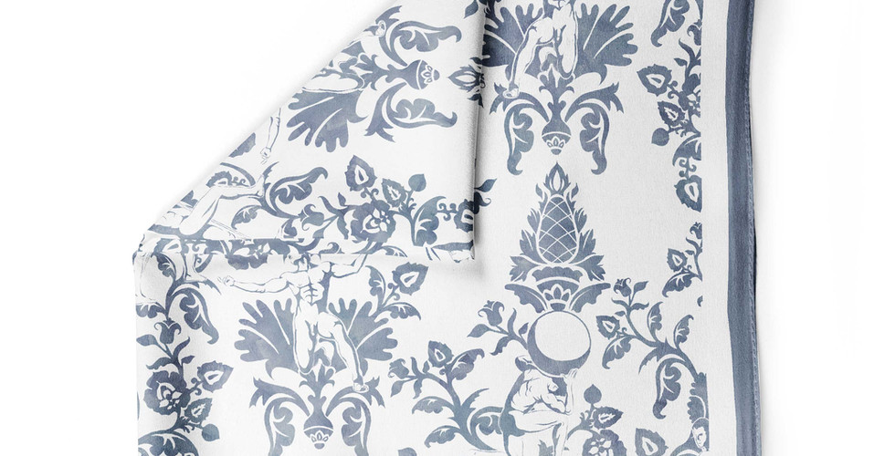 The design uses a classic damask layout with scrolls, leaves, flowers, and classic male figures. Currently I'm taking a step back to see if there are any issues (there is), if the design flows with a balance of positive and negative shapes, and if the design is actually finished. At this point the design has a charcoal watercolour fill but I'm thinking of other colour palettes as well. Oh, and I guess it needs a name!